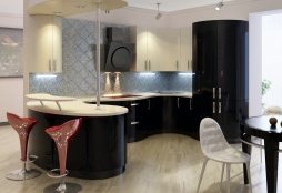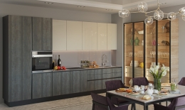 Безусловным связующим двух цветов сделайте стеновую панель по индивидуальному эскизу. Эта «Мэлани» - для поклонников строго модерна. Особый шик модели придадут верхние фасады со стеклом «Lakobel» и утолщенная столешница. Прямые линии фасадов мы рекомендуем Вам подчеркнуть соответствующей стилю фурнитурой. Простота линий, точность деталей делают эту кухню настоящим архитектурным шедевром! Смелость изогнутых линий, насыщенность и блеск покрытия помогут Вам создать современную кухню в духе последних тенденций мебельной моды.